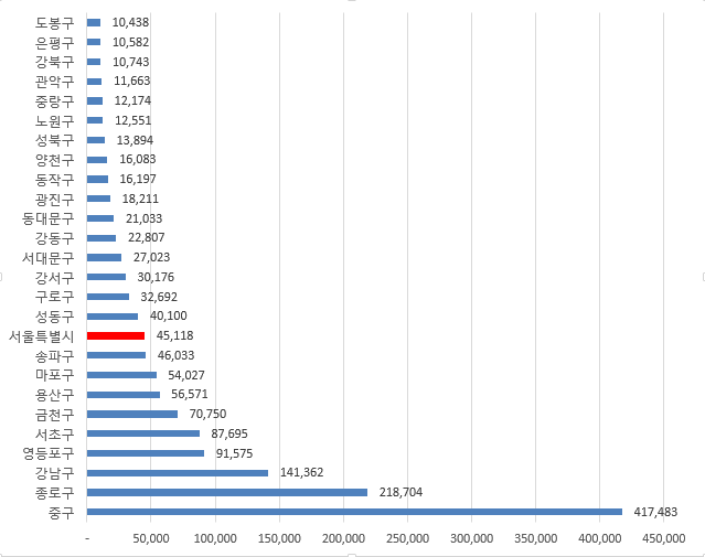 구별 GRDP 규모는 강남구가 71조8,530억원으로 가장 크며, 중구(53조8,230억원), 서초구(35조5,700억원)순으로 나타났다. 가장 규모가 작은 구는 강북구로 3조2,836억원으로 나타나, 강남구는 강북구의 21.9배 수준이다.
