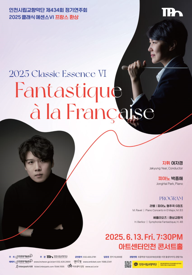 인천시립교향악단은 오는 6월 13일(금), 아트센터인천 콘서트홀에서 “2025 클래식 에센스Ⅵ : 프랑스 환상”을 개최해, 프랑스 음악의 다채로운 색채와 감각적 아름다움을 집중 조명한다.