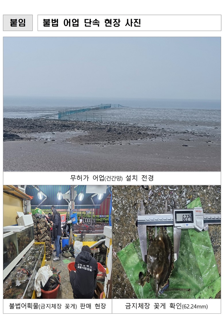 단속 결과, 무허가어업 4건, 불법 어획물 판매 금지 위반 1건, 불법 어구 적재 위반 1건 등 총 6건의 불법 행위를 적발했다. 구체적으로는 A 수산물 판매업자가 판매 금지 체장(6.4cm 미만)의 꽃게를 판매하다 적발됐으며, B 어업인은 승인받지 않은 어구(그물코 규격 위반 어망)를 어선에 적재한 사실이 확인됐다. 또한, 다수의 어업인이 해상에 불법 건간망을 설치해 수산물을 불법 포획‧채취한 것으로 드러났다.