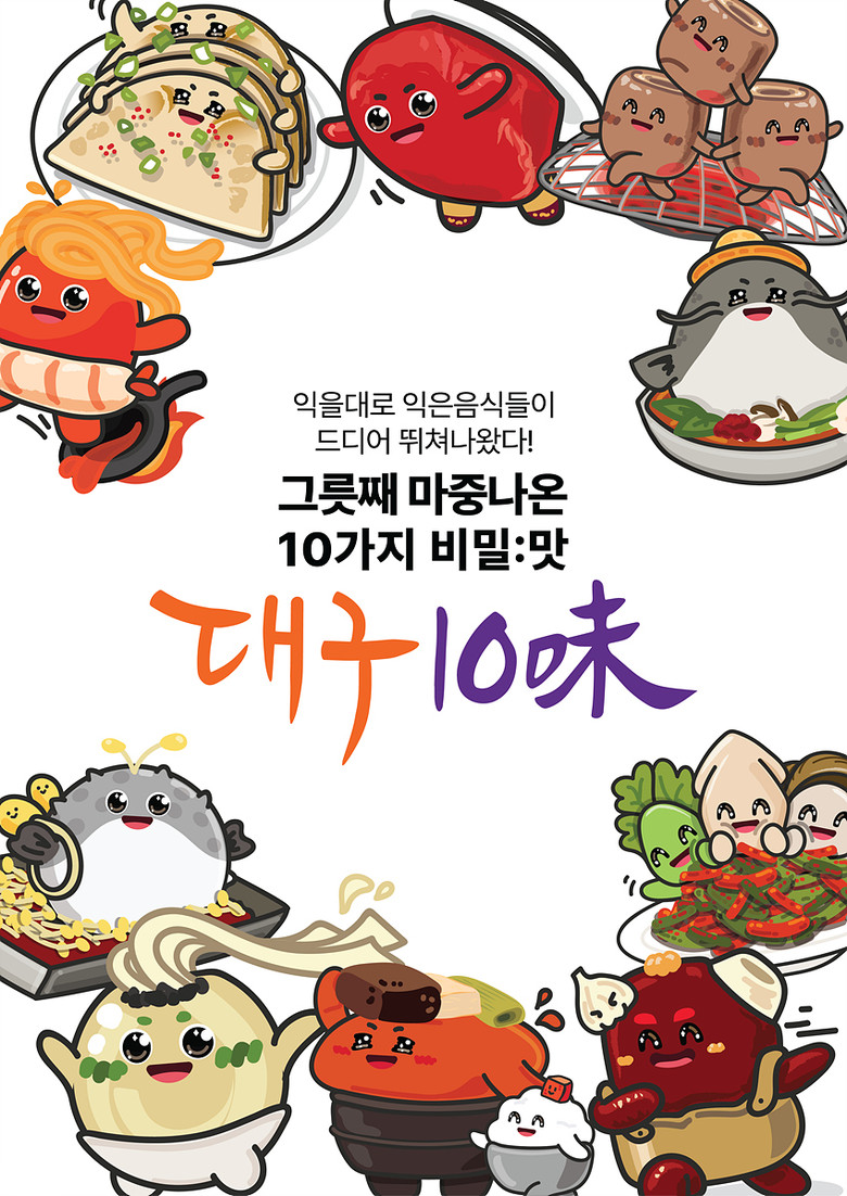 ▸ 대구 대표 음식의 매력을 새로운 방식으로 홍보해 대구 음식 관광 활성화 도모 [대구 세계타임즈=한윤석 기자] 대구광역시는 대구의 향토 음식과 문화를 널리 알리기 위해 대구10미(味) 캐릭터 10종을 개발하고 저작권 등록 및 상표 출원 절차를 진행하고 있다.