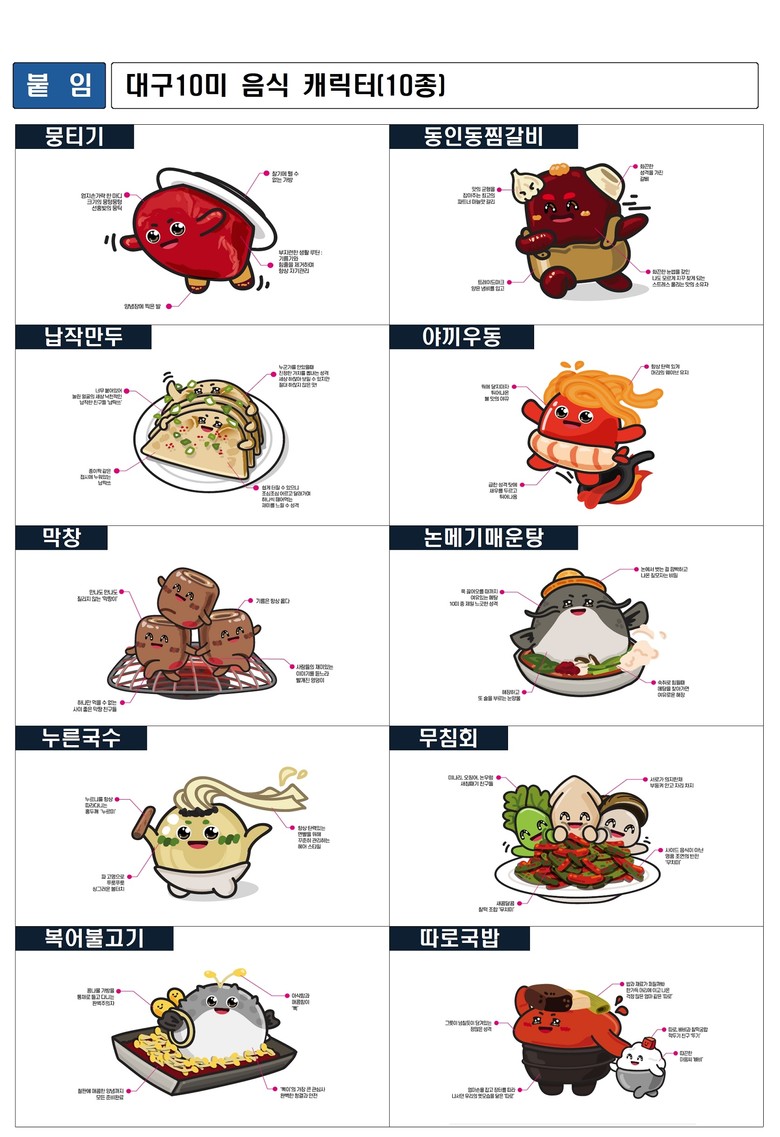 이번에 개발된 10종의 캐릭터는 분지 지형의 대구의 모습을 그릇으로 형상화해 10가지 음식이 그릇에 담긴 모습으로 표현했으며, 각각의 음식의 특색과 스토리를 담아 디자인했다.