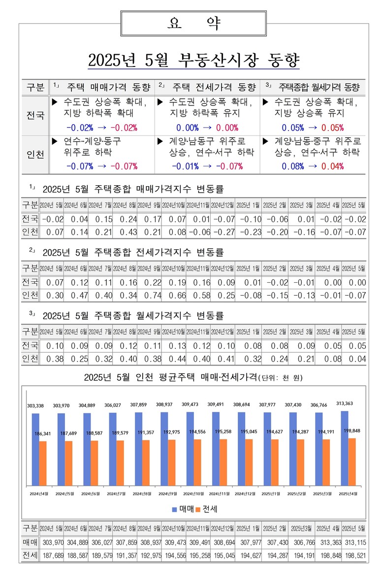 - 부동산시장 동향 및 아파트 실거래가→ ChatGPT 공개 - [인천 세계타임즈=심하린 기자] 인천광역시(시장 유정복)는 2025년 5월 주택 매매가격이 전월과 동일한 수준으로 하락했다고 밝혔다.
