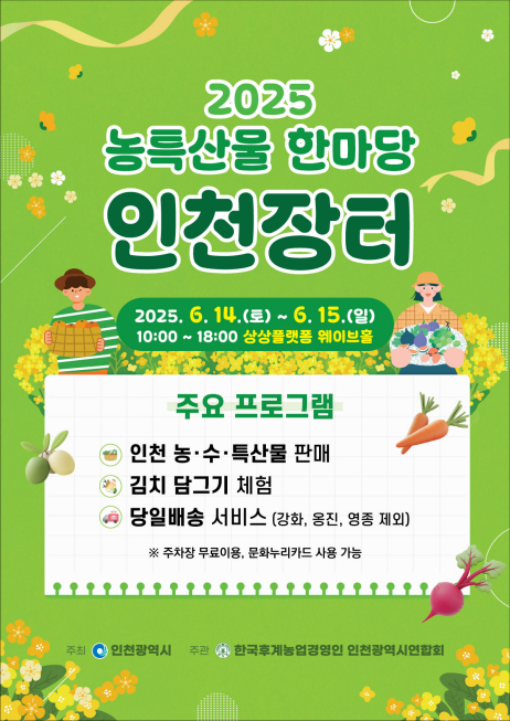 오는 14일(토)부터 15일(일)까지 2일간 열리는 ‘2025 농특산물 한마당 인천장터’ 현장에서 특산물(된장, 고추장, 순무김치, 포기김치 등), 농산물(쌀, 버섯, 쌈채소, 오이 등), 수산물(절단 꽃게, 건어물, 생선, 육수 팩 등), 축산물(한우, 한돈 등)이 판매되며 김치 담그기와 전통 놀이 체험 등이 진행된다. 특히 한우, 한돈이 할인 판매되며 5만 원 이상 구매 시 당일 무료배송 서비스도 제공된다.