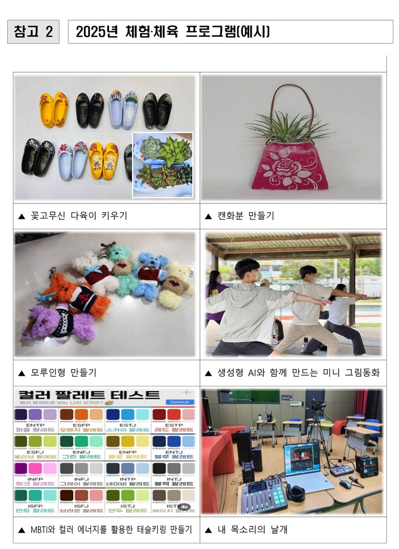 올해 운영되는 프로그램은 ▲체험 프로그램 ▲단계별 심화 체험 프로그램 ▲체육 프로그램 등으로 마련됐다. 특히, 캔 화분 만들기, 꽃고무신 다육이 키우기, 생성형 인공지능(AI)과 함께 만드는 미니 그림동화 등 총 10가지 체험 프로그램은 오는 6월 21일부터 11월 22일까지 금요일과 토요일(월별 상이)에 걸쳐 총 21회 진행된다.