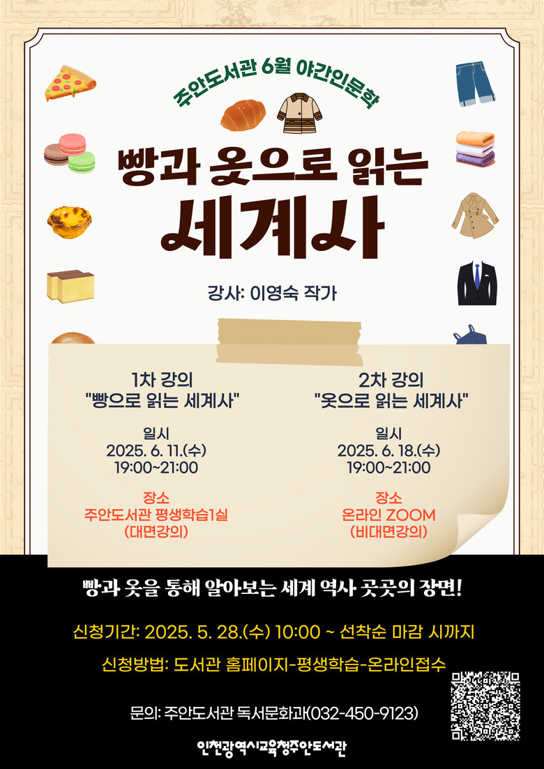 이번 강좌는 ‘옷장 속의 세계사’, ‘빵으로 읽는 세계사’, ‘지붕 밑의 세계사’ 등 다양한 도서를 집필한 이영숙 작가를 초청하여 2회에 걸쳐 진행된다.