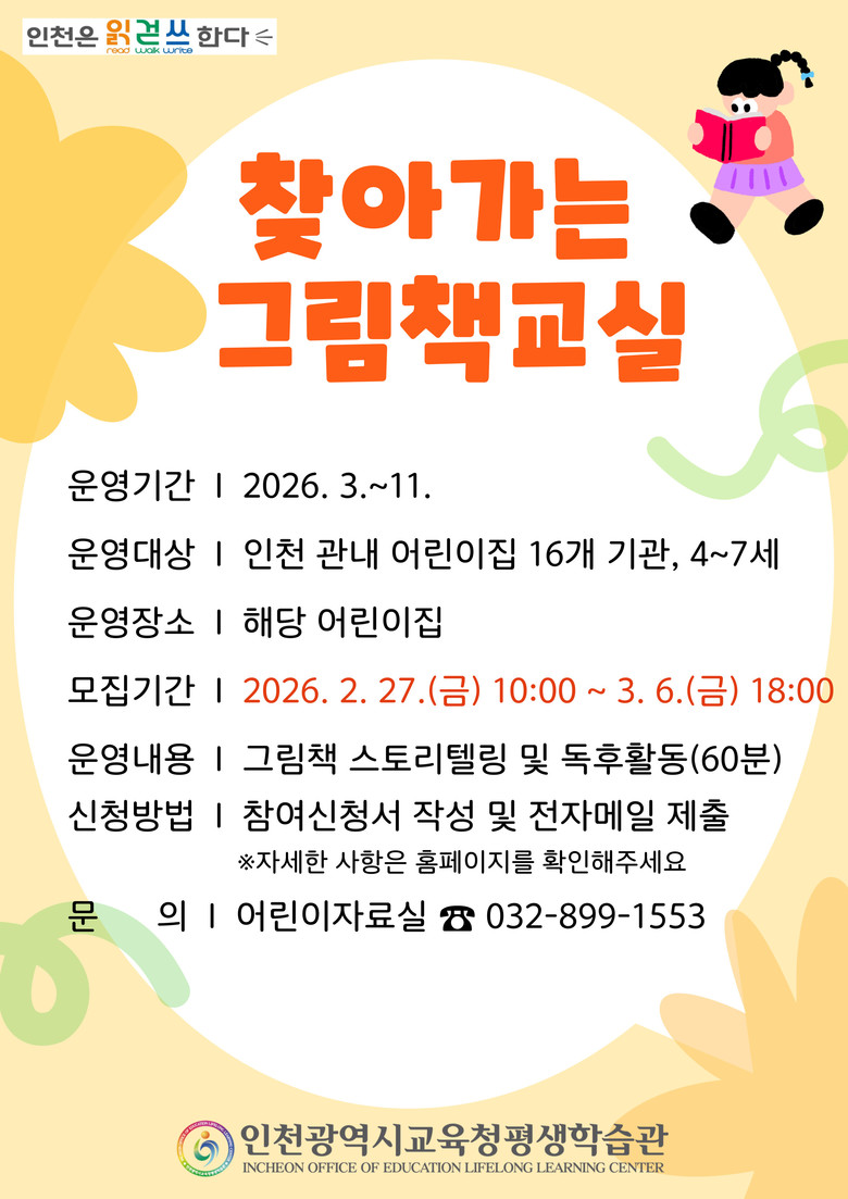 [인천 세계타임즈=심하린 기자] 인천광역시교육청평생학습관(관장 이재길)은 오는 27일부터 ‘찾아가는 그림책교실’에 참여할 인천 관내 어린이집을 모집한다.