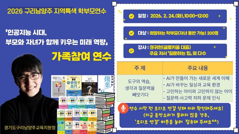 구리남양주교육지원청은 2월 26일(목) 2차시 「다시 질문,‘자녀의 시대’를 위한 경쟁력」 연수를 통해 질문 역량과 읽기·쓰기 기반 학습 전략을 이어갈 예정이다.