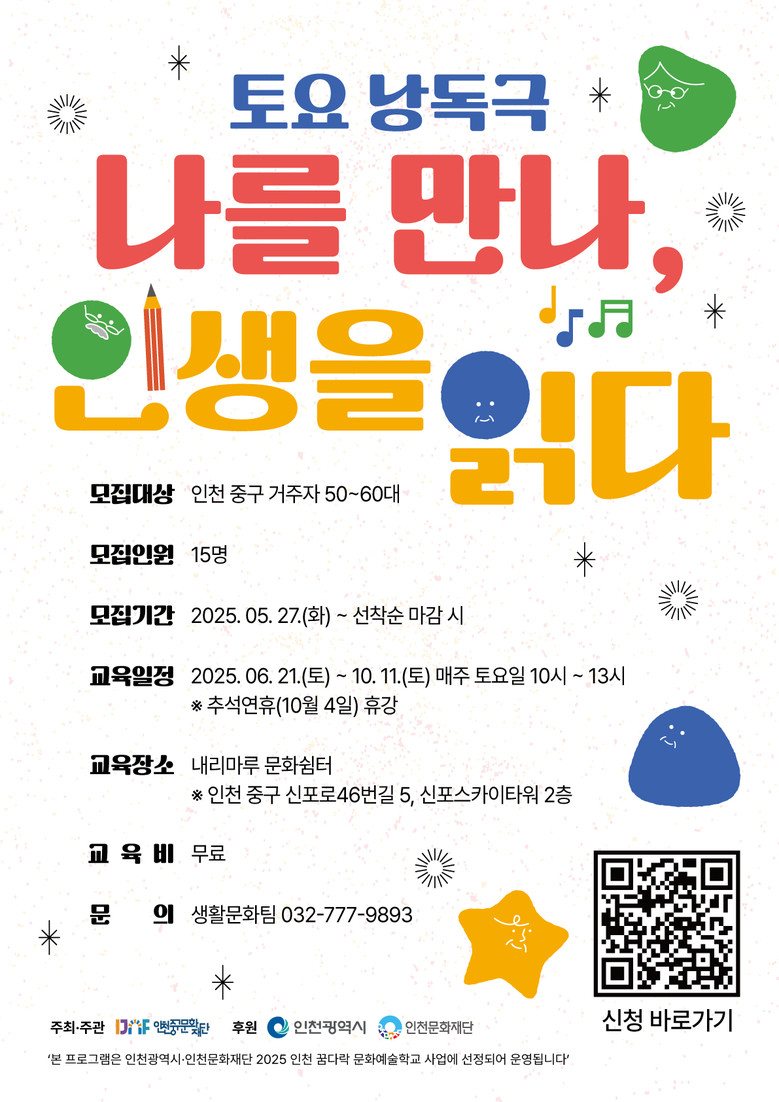 참여 대상은 인천 중구에 거주하는 50~60대의 중장년이다, 참가 희망자는 인천중구문화재단 누리집에서 온라인 신청하거나 재단으로 전화 신청하면 된다. 더 자세한 내용은 재단 누리집(https://ijcf.or.kr)을 통해 확인할 수 있다.