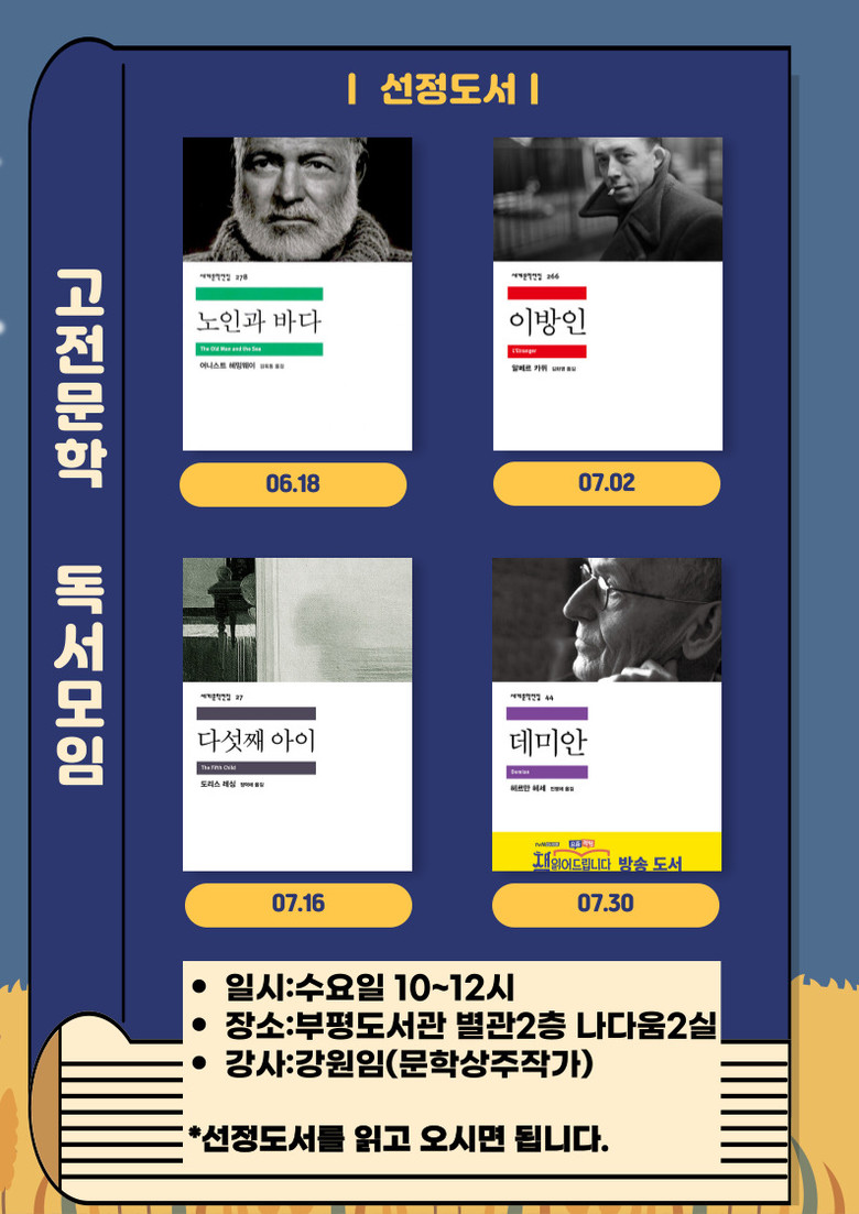 ‘고전읽기 독서모임’은 『노인과 바다』, 『이방인』, 『다섯째 아이』, 『데미안』 등 작품을 함께 읽고 토론하며, 문학적 상상력과 인간 내면에 대한 이해를 넓히는 프로그램이다.