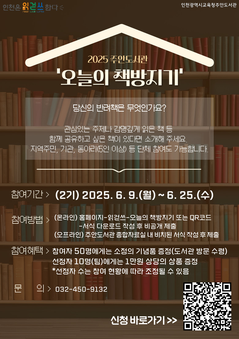 [인천 세계타임즈=심하린 기자] 인천광역시교육청주안도서관(관장 곽미혜)은 시민이 책을 추천하고 지역과 소통하는 독서 문화 프로그램 ‘오늘의 책방지기(반려책)’ 2기 참여자를 6월 25일까지 모집한다.