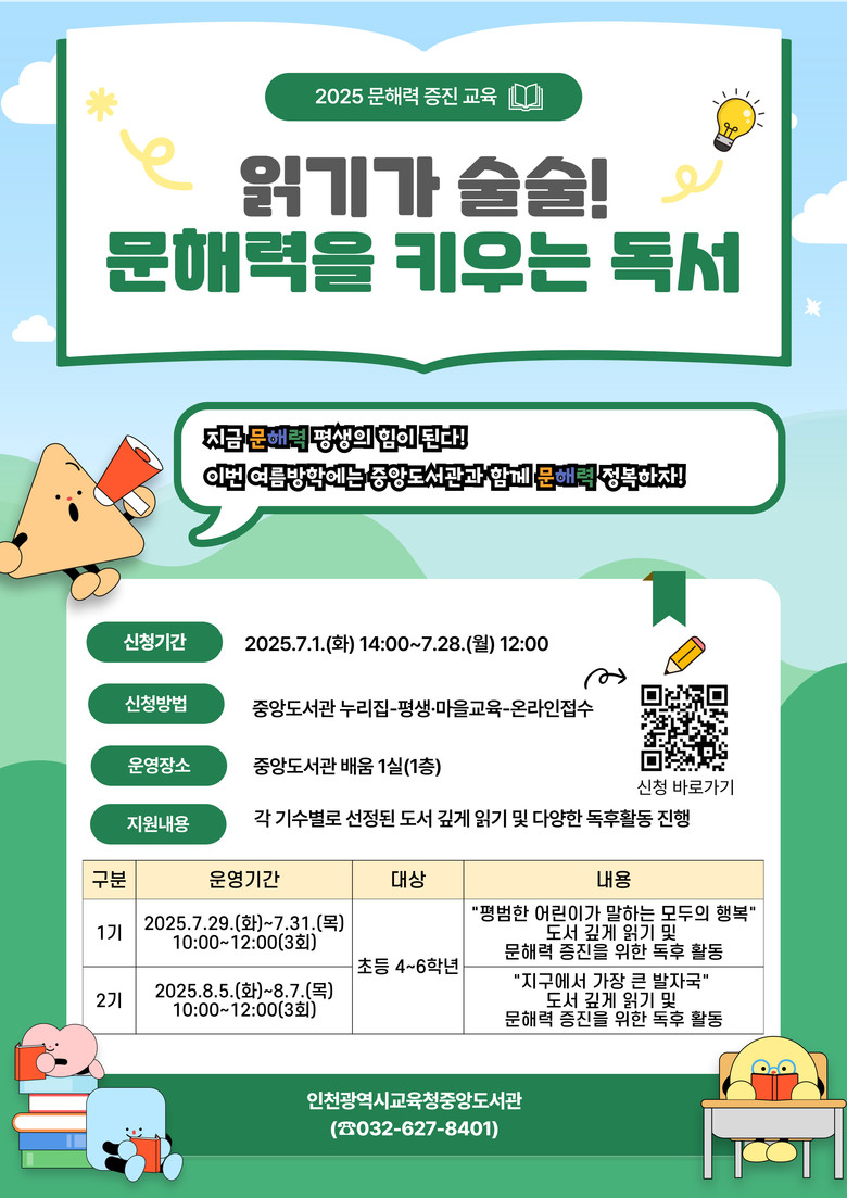 프로그램 신청 및 자세한 내용은 중앙도서관 누리집(https://lib.ice.go.kr/jungang/index.do) 또는 어린이자료실(☎032-627-8401)로 문의하면 된다.