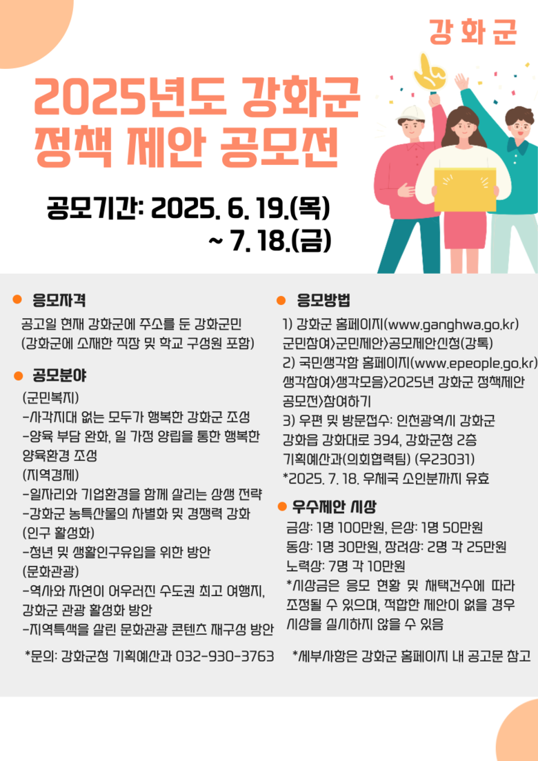 제안 접수는 강화군 또는 국민생각함 홈페이지 등 온라인을 통해 응모할 수 있으며, 강화군청 기획예산과로 우편 또는 방문 접수도 가능하다.