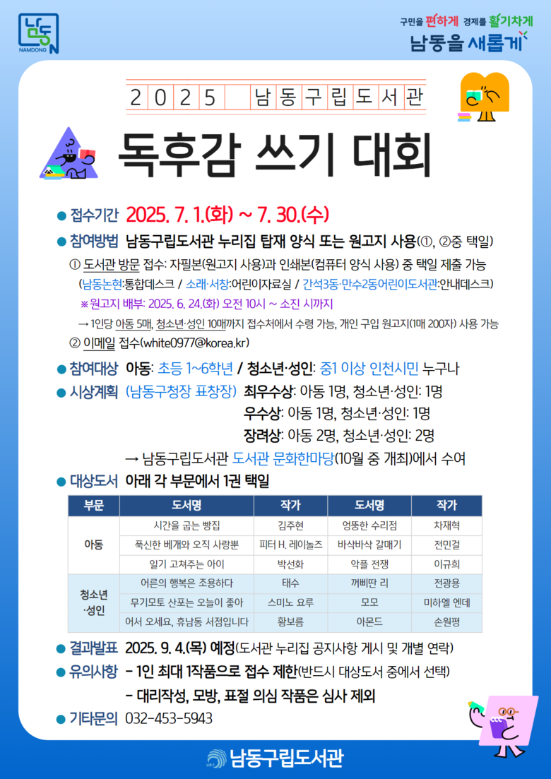 남동구립도서관 독후감 쓰기 대회는 올해로 세 번째 개최되는 사업으로, 지역 내 독서문화 확산 및 독서 의욕 고취에 기여하고자 마련됐다.