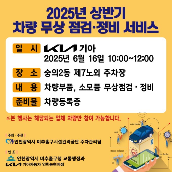 점검 시간은 오전 10시부터 12시까지이며, 서비스 대상은 기아자동차 소유주로 차량 등록증을 지참하면 누구나 참여할 수 있다.