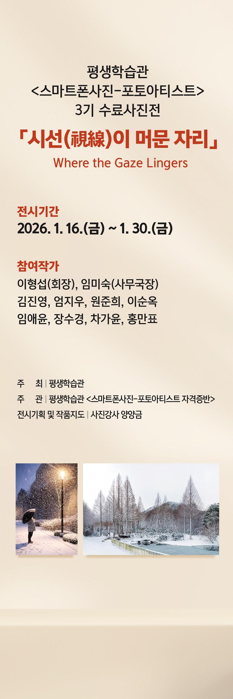 전시는 1월 16일부터 30일까지 광주시 평생학습관 2층 전시실에서 열린다. 이번 전시에는 3기 수강생 10명이 참여해 총 20점의 작품을 선보인다. 참여 수료생들은 스마트폰 카메라를 활용해 일상과 삶의 순간을 각자의 시선으로 담아냈으며 단순한 기록을 넘어 개인의 경험과 내면의 이야기를 사진으로 표현했다.